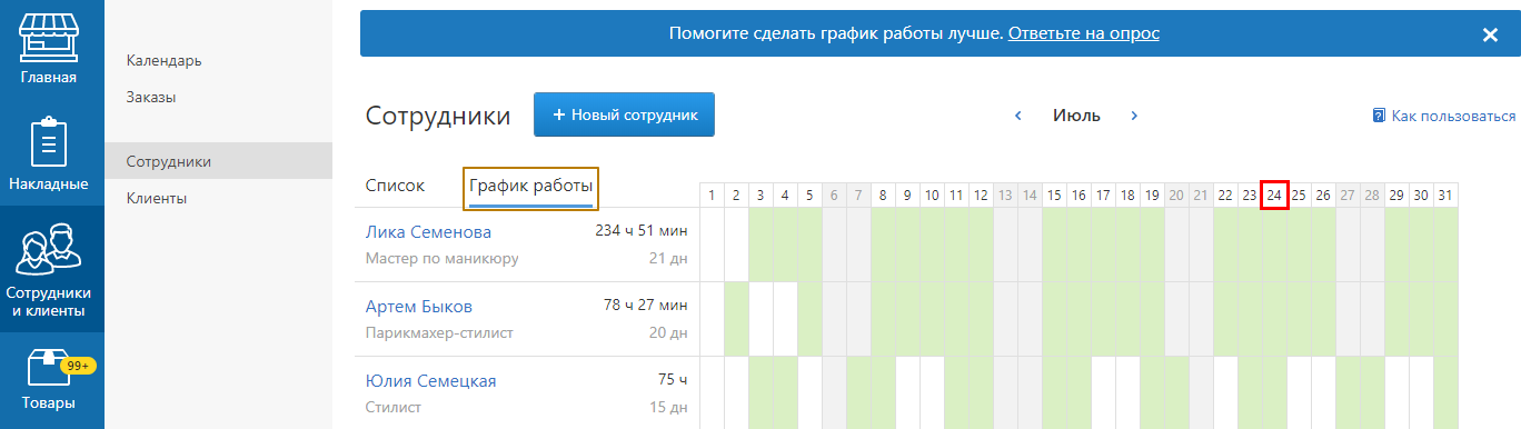 С помощью графика удобно записывать клиентов на оказание услуги конкретным мастером. Теперь в графике вы можете учитывать обеденные перерывы и добавлять ночные смены.
